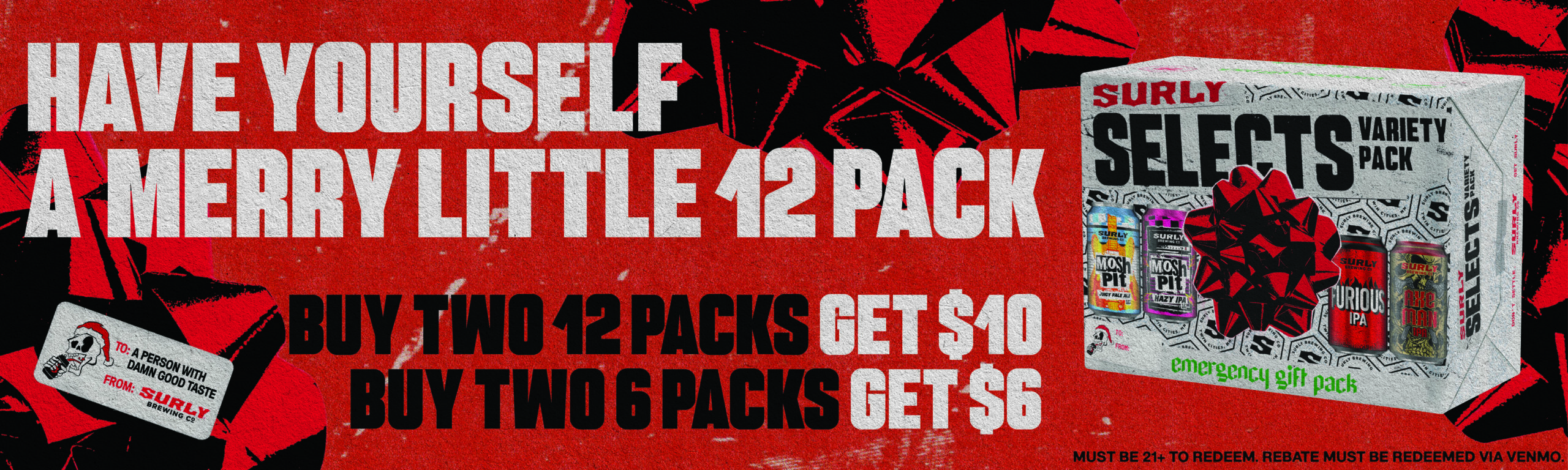 This year, give the gift that already has a bow and a tag on it: Surly’s Merry Little 12 Pack, featuring Furious, Axe Man, Mosh Pit Hazy, and Mosh Pit Juicy. And have yourself a Merry Little Rebate—buy two Surly 12-packs, get $10 back via Venmo through the holidays! Link in bio to redeem.