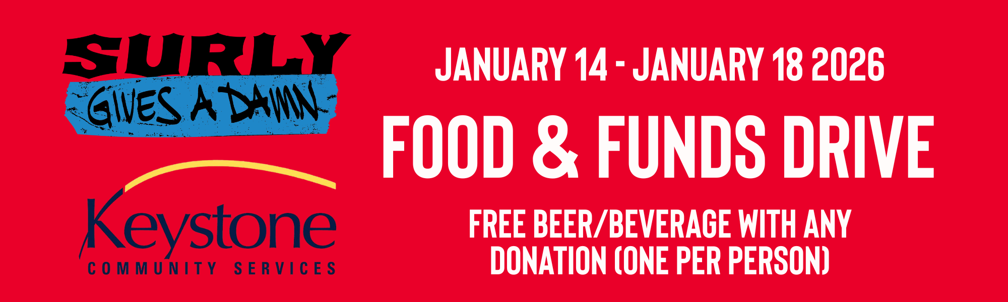 Please join us this week in action. Surly Gives A Damn has set up a FOOD & FUNDS drive at the beer hall benefitting Keystone Community Services, a local nonprofit food shelf. On Wednesday & Thursday this week, 15% of your check at the Beer Hall and Pizza Upstairs will be donated directly to support the work Keystone is doing right now. Come eat, drink and do some good in the process.