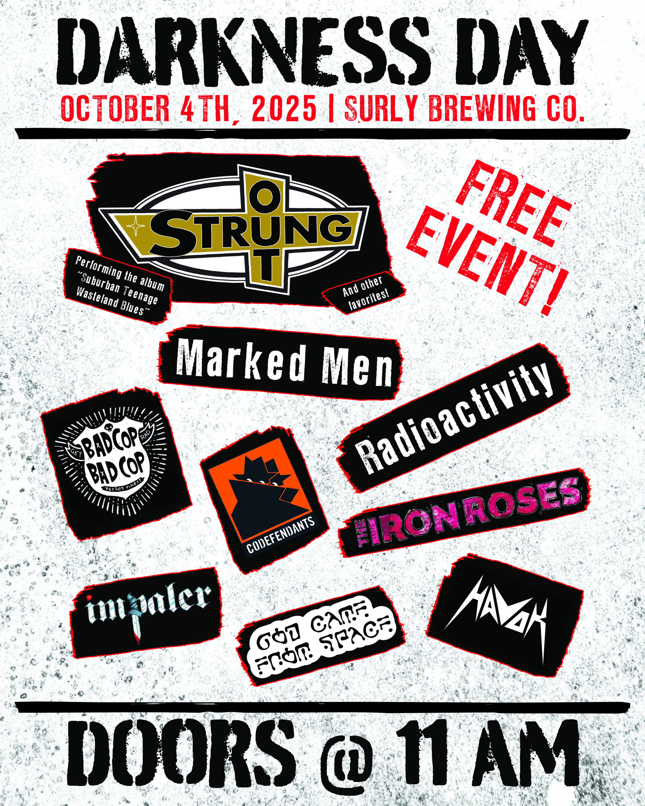 We have another massive lineup playing Darkness Day this year! Our signature blend of metal, punk, rock, and whatever you want to call Impaler returns for another day of live, loud, and free music. Your rundown is below, but first you should pull up this Spotify playlist so you can have the appropriate soundtrack.