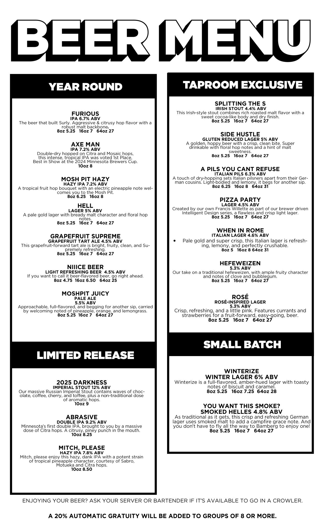 Surly Pizza Upstairs is located on the second level of our destination brewery. Use the large staircase or elevator to get upstairs.