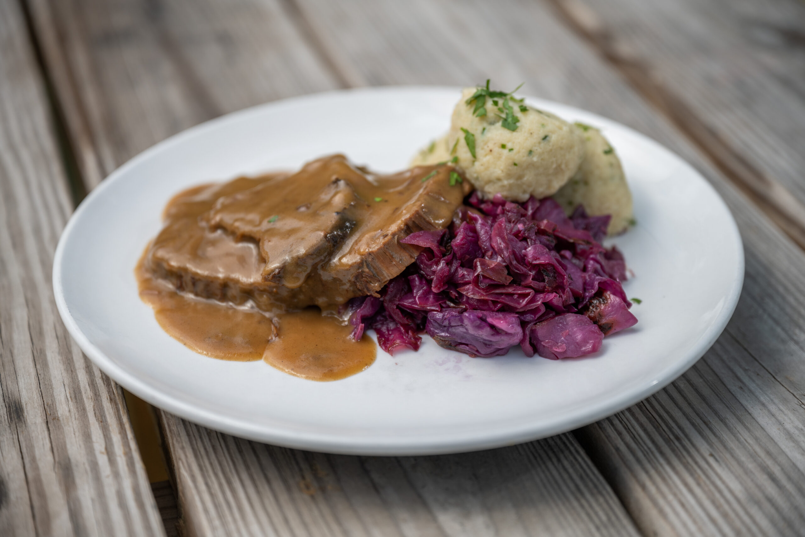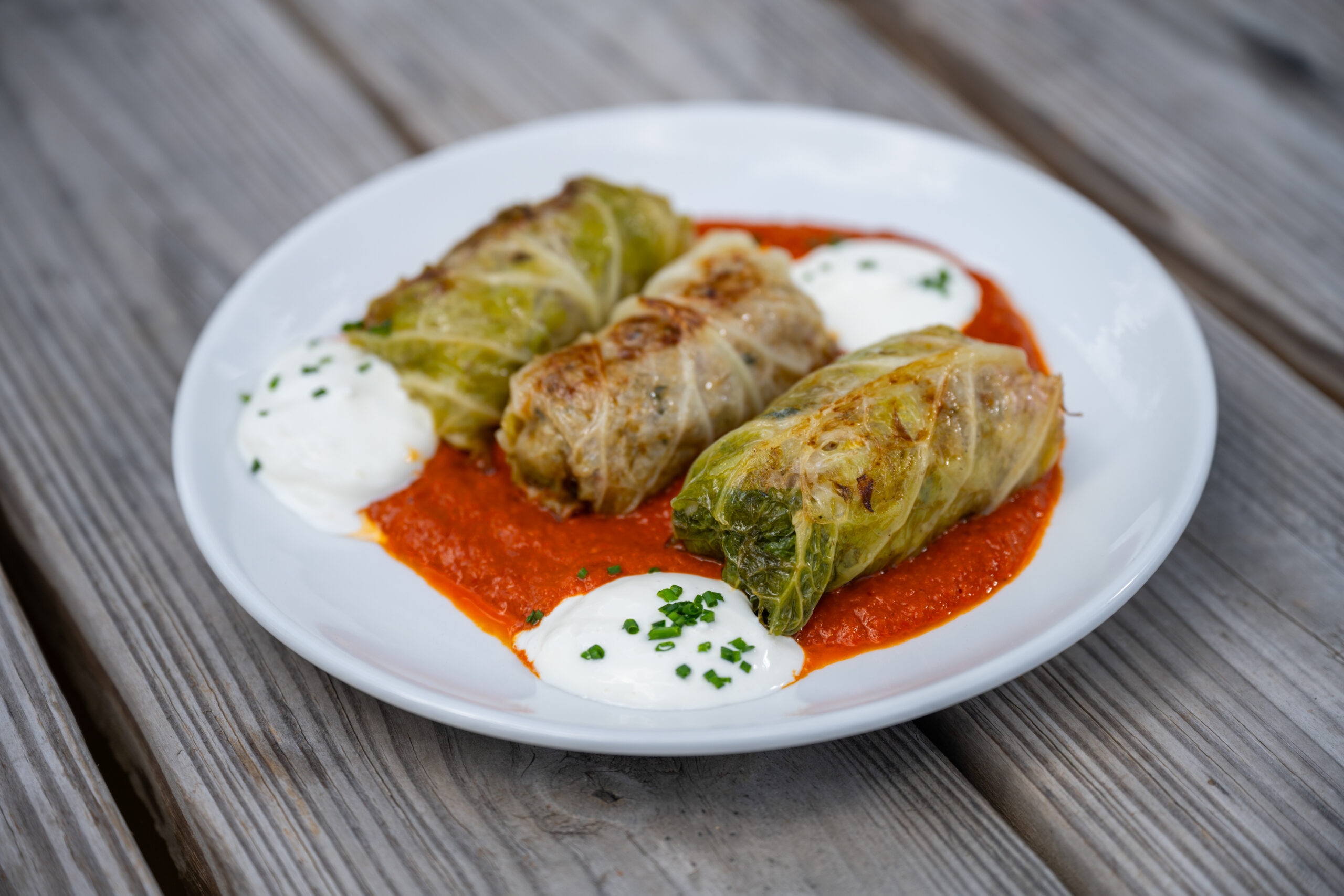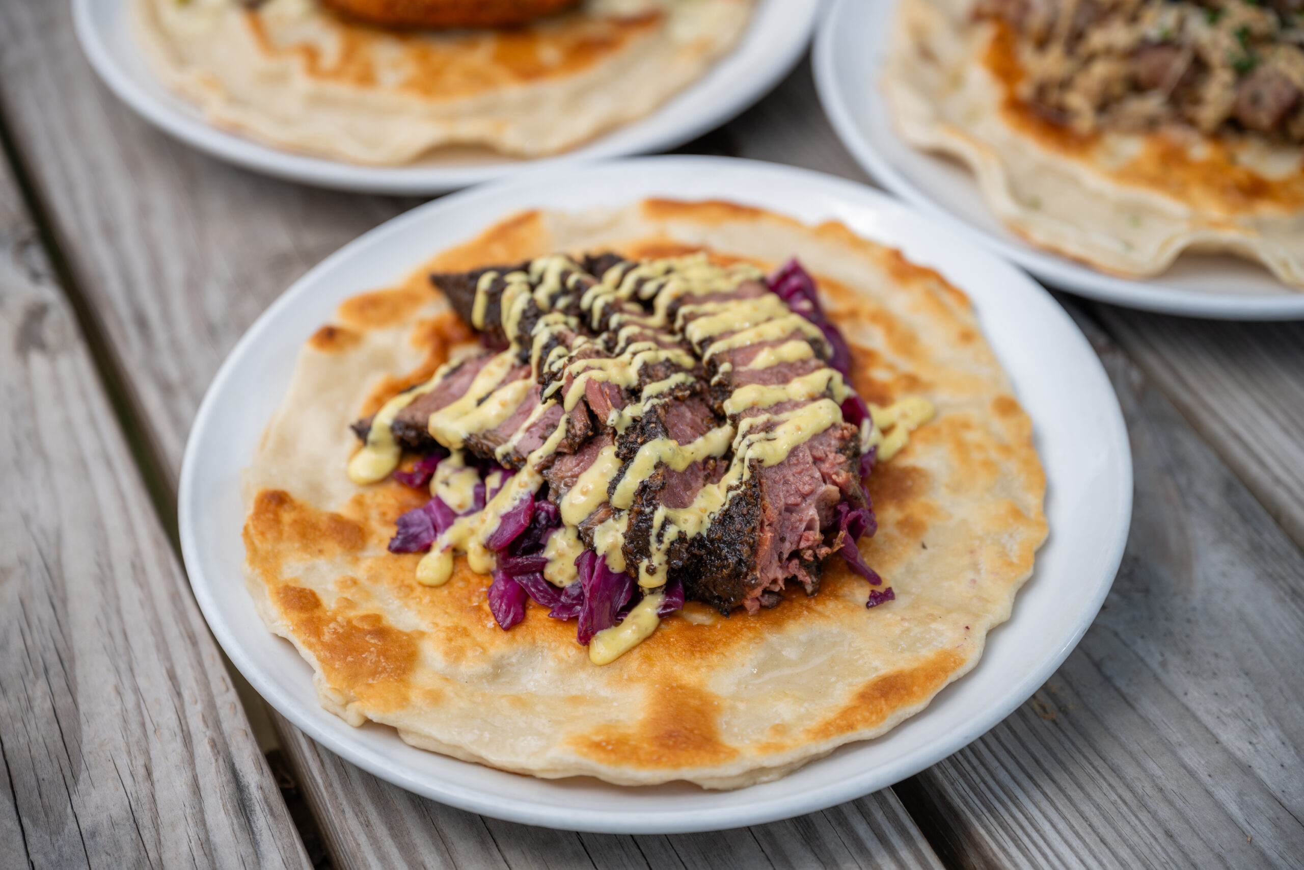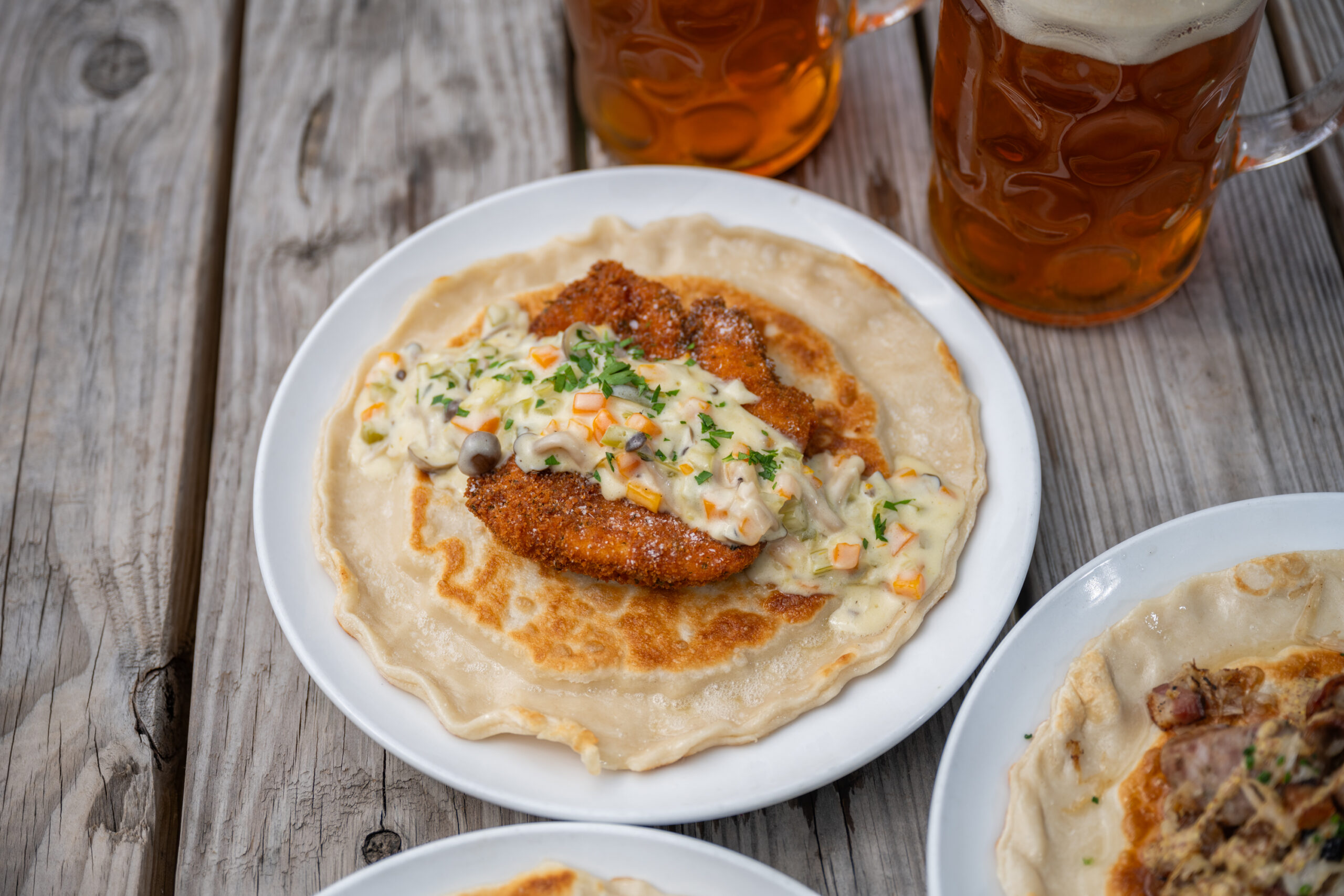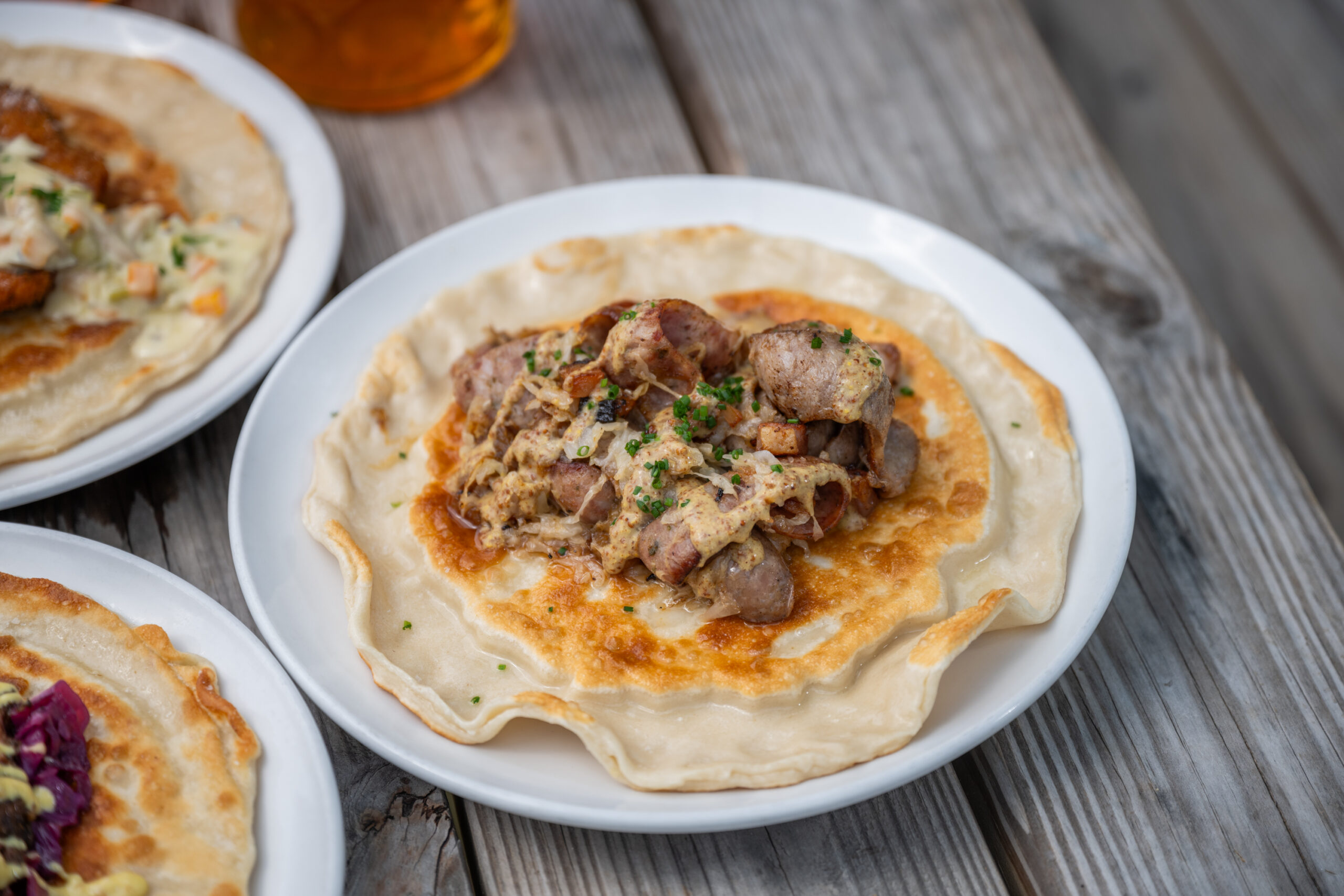 Our celebrated beer hall pierogis get supersized and topped with your choice of sausages, chicken schnitzel, or pastrami.