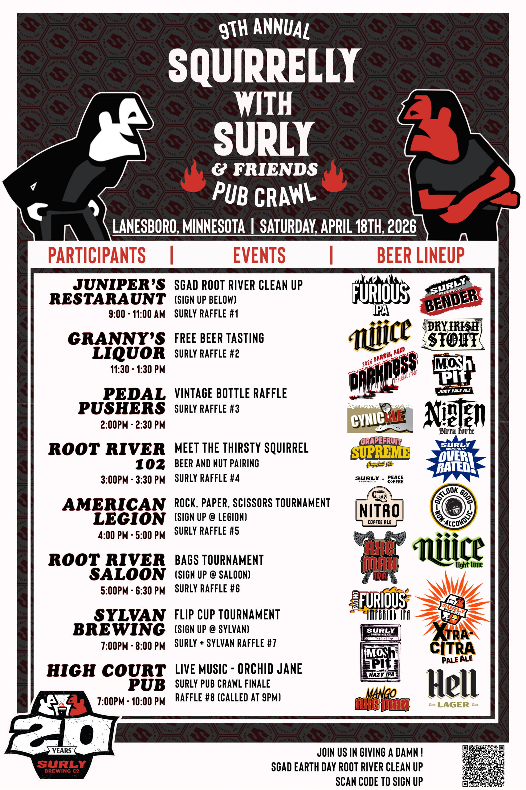 The 9th Annual Squirrelly with Surly Pub Crawl is coming to Lanesboro! Enjoy tap takeovers, unique beers, samples, raffles, live music, and more all over town! This is our most popular event in SE Minnesota and we look forward to seeing you out there every year. PARTICIPATING LOCATIONS: High Court Pub, Root River Saloon, Juniper's…